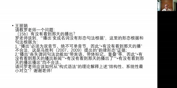 罗仁地教授首先介绍了语言类型学、极点构式语法(Radical Construction Grammar)的一般观点,强调以这种语言观分析语言以及做类型比较的时候,要注意三点:(1)看某种语言是否制约某种语义领域(是的话,看条件);(2)如果不同语言制约同一个领域的话,看制约的程度;(3)如果不同语言制约同一个领域的话,看制约的方式。接着罗仁地教授基于真实自然语料审视了汉语类型上与印欧语系语言不同的特点,包括句子结构、关系子句结构、词类问题、句法关系问题和动词论元结构问题等。比如词类问题,构式的存在不需要设置全语言性的范畴,因此词类的问题就不存在,如黎锦熙所说的:“凡词,依句辩品,离句无品。”(1924:24)“由职显类。”(1953:10-11)再比如论元结构构式,汉语并没有语法化任何论元结构构式,没有什么alignment,因为没有论元结构构式,这可能与汉语的论元搭配自由有关。最后在自由讨论阶段,罗仁地教授就师生提出的“汉语信息结构”“汉语的类型特点”“汉语词类”等问题做了耐心细致的解答(讲座已公开,参:https://www.bilibili.com/video/BV1k64y1m775?share_source=copy_web)。