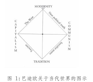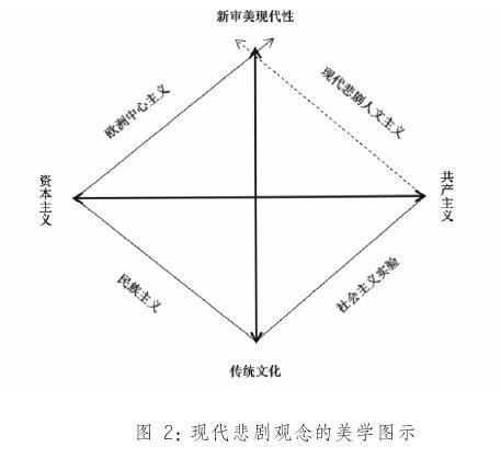 紧接着,王教授着重介绍了他对中国审美现代性的逻辑结构的研究。受阿兰·巴迪欧(Alain Badiou)关于当代世界的图式启发,王教授对之加以美学转换(如下图),特别指出,中国在反帝背景下形成的“民族主义”不同于西方以进化论为核心的“法西斯主义”,而如果将巴迪欧提出的“新的政治真理性”(New political truth)放置在中国语境中,即伊格尔顿多次阐发的“悲剧人文主义”。王教授提醒大家,伊格尔顿在《马克思为什么是对的》《甜蜜的暴力——悲剧的观念》及新著《悲剧》中,连续思考了审美现代性与悲剧人文主义的关系。基于对阿尔都塞(Louis Pierre Althusser)“多元决定”和“半自律性”的观念认同,王教授将这一美学图式划分成三个基本的结构关系进行解释。具体而言,即在“资本主义-传统文化-乌托邦冲动”结构中,形成中国现代化进程中的“民族主义”;在“传统文化—资本主义-欧洲中心论”结构中,形成“标准版审美现代性”;在“传统文化—红色乌托邦—悲剧人文主义”结构中,形成“新审美现代性”“中国审美现代性”。在此,王教授指出,“悲剧人文主义”才是激发当代中国人信仰的重要文化形式。