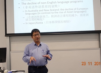 本次研讨会澳方主持人、新南威尔士大学高雪松副教授的主题报告以《中国高校外语课程发展的挑战》为题,针对“一带一路”建设背景下,当前中国大学非英语外语学位课程飞速增长的状况进行了详细而深入的分析。他认为,为了应对社会需要,快速发展是必要的,但有的明显存在课程目标不切实际、教师短缺、对高素质课程申请者吸引力有待提升等问题,并相应地提出了对策建议。