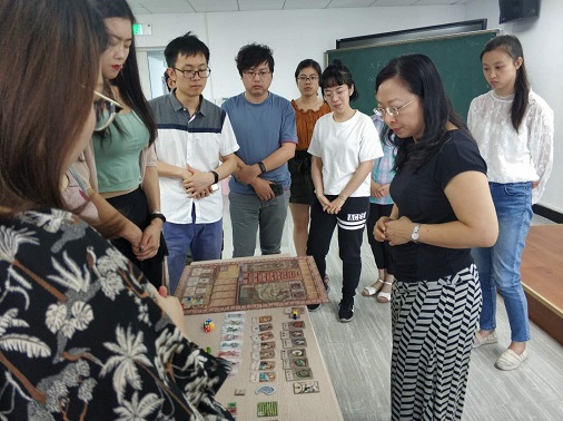 施如龄教授的演讲条理清晰、幽默生动。为了能使同学们更好的理解游戏,施教授运用动画视频展示了游戏的过程,并为同学们带来一套卡牌,让大家更好的理解游戏运行机制。