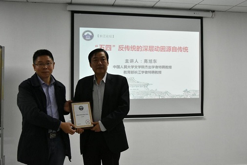 4月25日晚19:00,球王会主办的“中国新诗接受史研究(1917-1949)”高端论坛系列讲座,继续在振华楼举行。中国人民大学球王会杰出学者特聘教授高旭东先生为广大师生做了一场题为“‘五四’反传统的深层动因源自传统”的精彩讲座。球王会副经理方长安教授主持讲座,并为其颁发纪念证书。