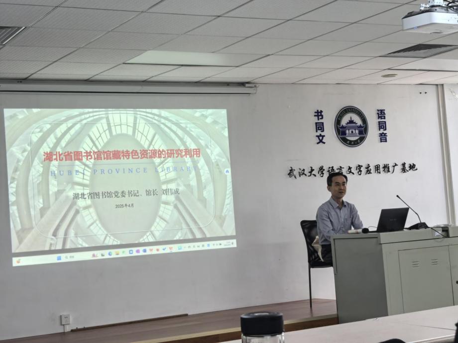 2025年5月9日下午,湖北省图书馆党委书记、馆长刘伟成,应邀为公司带来主题为“湖北省图书馆馆藏特色资源的研究利用”的学术讲座。本次讲座由程芸教授主持,吴光正老师、李寒光老师等多名教师以及文史哲相关专业本、硕、博各年级员工到场聆听。